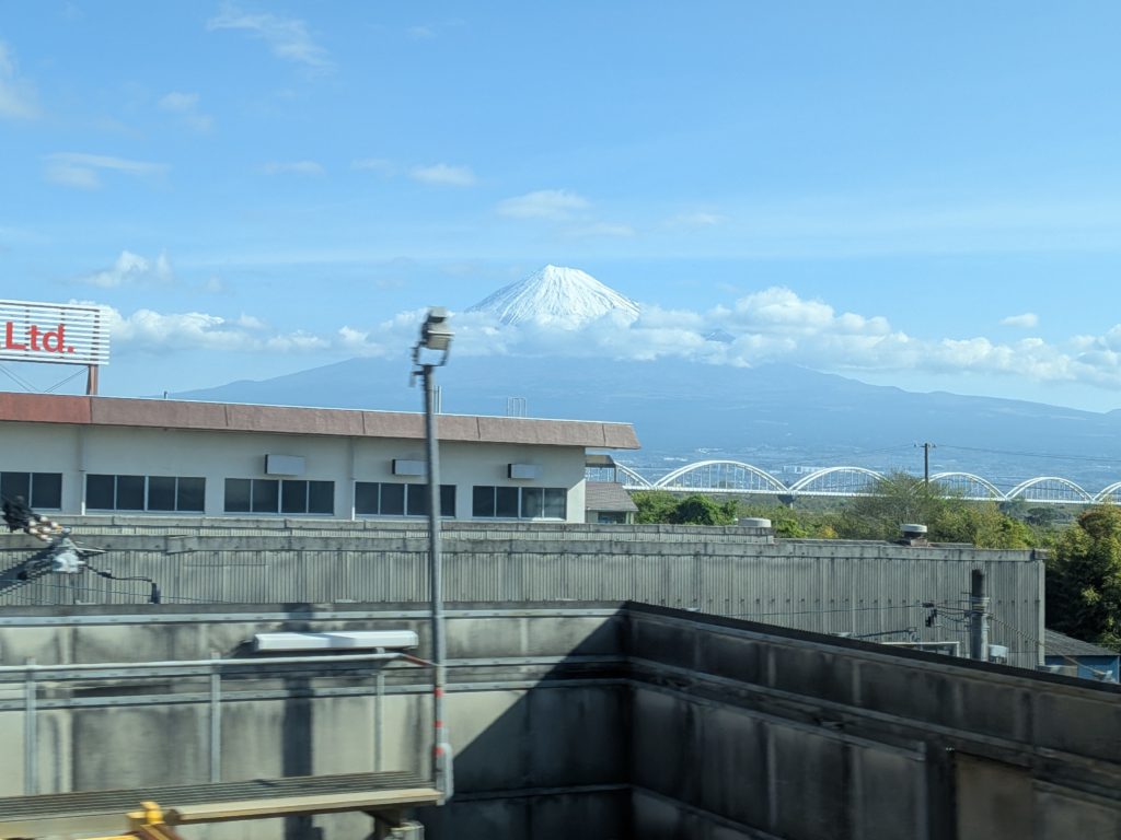 夫が富士山が見えるようにD列で席を取ってくれたので楽しみにしていたが、今日は雲が多くてずっとこんな感じ。「富士山は東京を発車して45分後が見頃」だとAIが言っていたのでアラームをかけておいたのだが、確かにその通りではあったので、覚えておこうと思う。