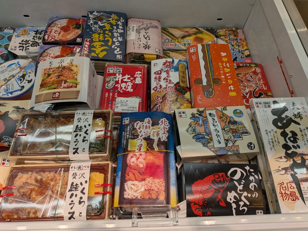 新幹線口の近くの売店は水了軒と淡路屋がフルラインナップという感じの売店が多い印象だが(水了軒は魅力的)、JR在来線近くの売店をのぞいたら、他地域の弁当も幅広く取りそろえていて、ちょっとびっくりした。北陸、広島、山陰、北九州エリアまでカバーしていて、関西圏の密度の濃さを感じた。こればっかりは羨ましい。京王駅弁大会で買いそびれた「しじみのもぐりずし」があって、うっかり買ってしまいそうになった。