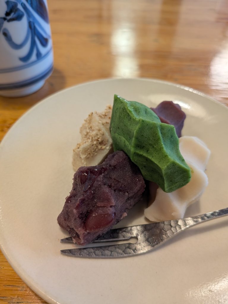 お茶がすぐ出てきて、5分もしないうちに高麗餅。抹茶、粒あん、こしあん、白あん、ごまあん、だったかな。全部違う味で、中に小さな求肥が入っている。ギリギリ握っているだけで、フォークで刺すとぼろっと崩れてしまう。多分、手に持って一気にポンと食べるのが正しいのかもしれないけど、フォークも添えて貰っているし、どうやって食べるのがいいのかなぁと色々苦戦しているうちにすぐに食べ終わってしまった。全部が違う味で、全部がおいしい。どれもうっとりする。確かに、これはどういう順番で食べるかは悩む。持ち帰りもできるけど、実際に食べてみると、これは持ち帰ってはいけない食べ物だなと思った。できたてを食べて、感動するのが正解だと思う。