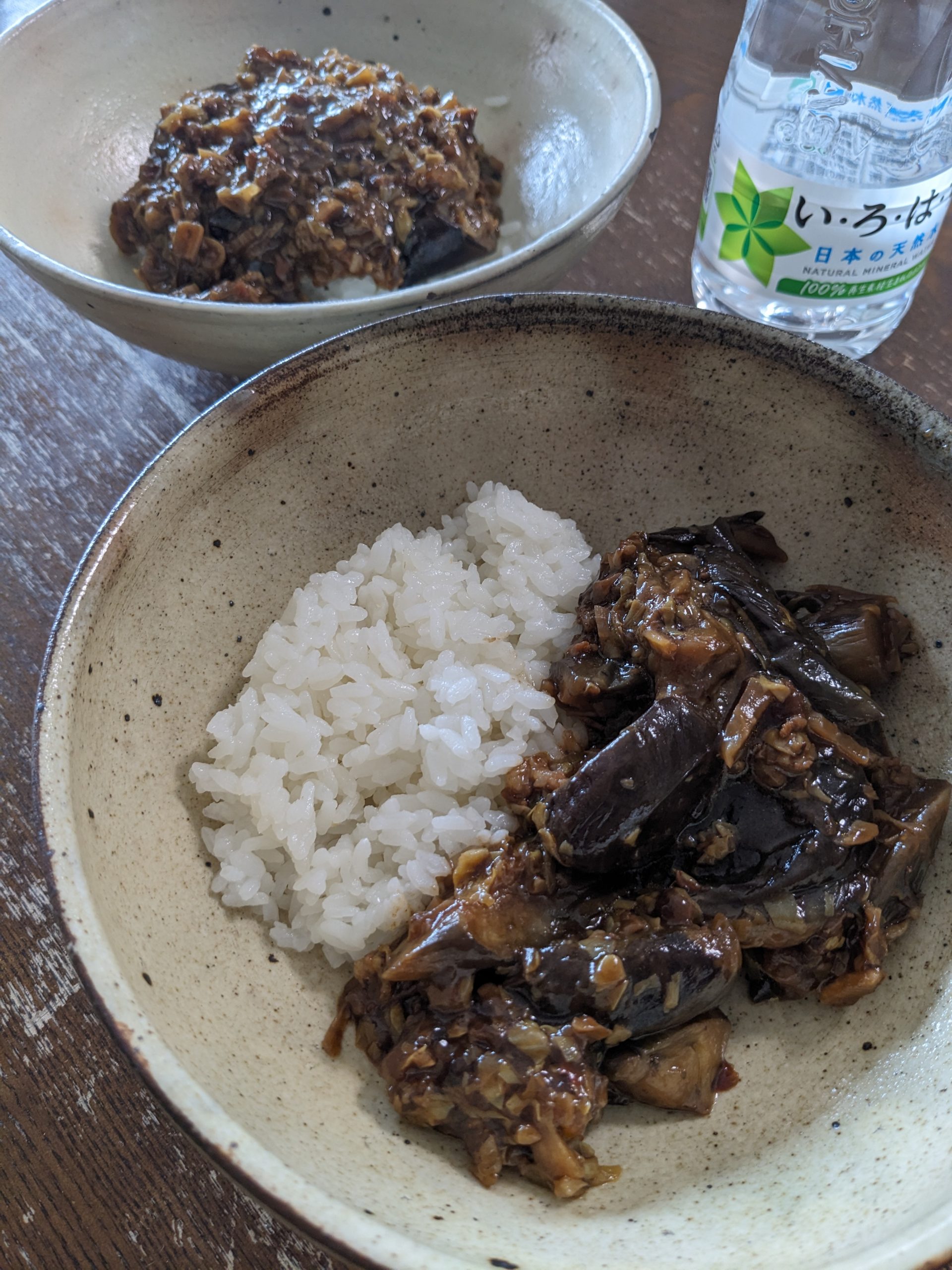 あとはナスが1袋残っていたので、色々考えた結果、昨日の餃子のタネ少し残ったのでそれと合わせて麻婆茄子っぽいものを作る。麻婆茄子のナスはやっぱり素揚げしたほうが断然おいしいけど、揚げ油昨日処分しちゃったから乱切りして多めの油でじわっと焼いた。テフロンのフライパンに、油、ニンニクのみじん切り、ドウチのみじん切り小さじ1、豆板醤小さじ1、甜麺醤小さじ1、しょうがチューブ小さじ1、米酢小さじ1の順番に炒めて餃子のタネを入れてしっかり炒めたら、ナスを加えてひと混ぜして、お湯1カップ、鶏ガラスープの素ひとつまみ、しょうゆ小さじ半分を入れて、5分ほど煮込む。最後に片栗粉小さじ1を大さじ1の水で溶いたのを回しかけてとろみがつくまで加熱する。ちょっと味濃かったかと思ったが、ご飯と食べると結構いい塩梅で、意外と後口もいい。花椒があったらなおよかったかも。蒸し暑い日にはこれくらいパキッと味がしっかりしたものを食べるのもいいものだと思った。それにしても今日は蒸す。自律神経の具合が良くなくて妙に目が回るし、忙しない日にこういう気候は勘弁してほしいものだと思いつつ、蒸すと感じているのは私だけで、更年期の症状が出ているだけなのかもと一瞬思った。