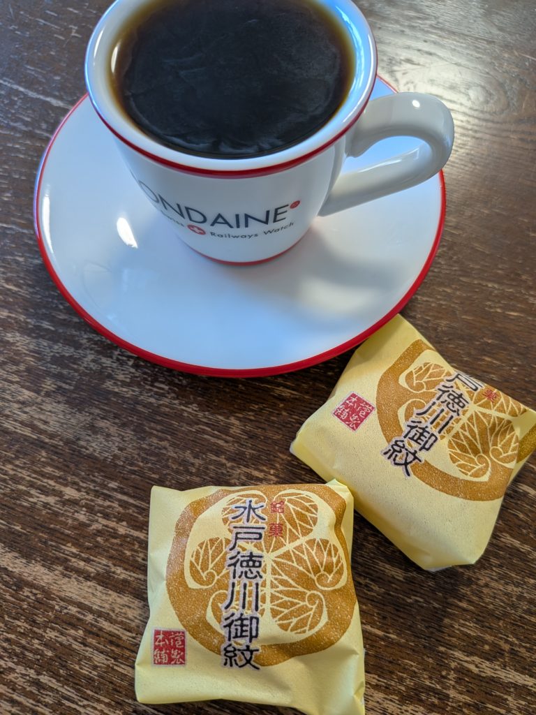パスタのあとは、必ず濃いめのコーヒーと甘いものが欲しくなる。チョコレートが最高だが、水戸みやげに貰った「水戸徳川御紋」がまだ残っているのでそれで。和菓子の桃山のような白餡の、いわゆるババ菓子だが、ちょっと口の水分が持って行かれる感じが、逆にコーヒーや濃いお茶の相手として最適だなとも思う。