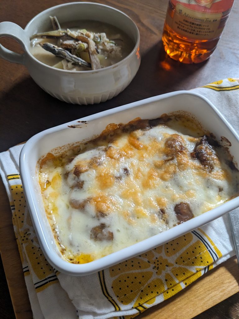 特に問題なさそうだったので、しゃーないね、これ食べないとねと、ご飯チンして耐熱容器にご飯を敷き、生玉子を落として、チンして温めたカレーを被せて、その上に冷凍していた溶けるチーズを散らして、オーブントースターで5分焼く。チーズからの油が縁に溜まっていてちょっとビビる。その間にお昼のお味噌汁を温めて、一緒に出す。