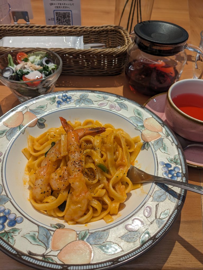 昼は外で食べる気満々だったが、待っている間に色々候補を潰していって、残ったのはAline café et sucreries(長いので、アリーヌカフェとうちでは言っている)。50%オフクーポンも持っているしで、一番高い海老クリームパスタにした。パスタがもっちりで、量もほどよく、しみじみうまい(サンドイッチも気になったのだが、ボリュームが凄そうで少しひるんだ)。飲み物は、コーヒー飲みたいな…と思いつつ、ローズヒップティーにした。エラいなあ、私。