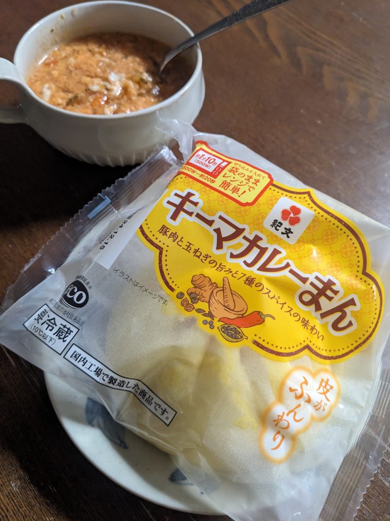 なーんか、料理するの面倒だなーというか、まだ冷蔵庫に半端に残っているものがある状態で新たに料理を作るのはよろしくないんじゃない、ということで、買い置きのキーマカレーまんを食べることにした。袋をちょっと破って、レンジで1分。私は普段はせいろを出して、きちんと12分蒸す人ですが、ひとりだとどんどんラクに走るなあ。あんまり期待していない分、結構おいしかった。あとは、100円ショップで買ってきたパウチのミネストローネ。小鍋に出して玉子を落として温めた。塩分に目をつぶれば、こういう晩ご飯もありだな。