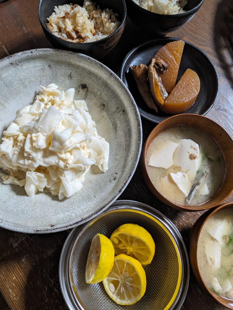 2週間、あんまり料理をしていなかったので、いざ作るとなるとどないしようかと悩む。もう20年近くやっていることでも、2週間も間があけば、そんなに料理なんかする必要のない若い人と同じレベルに戻ってしまうのが悲しいところだ。最初は、残ったほうれん草でクリームグラタンを作るつもりでいたのだが、手数が多いので面倒になってきてしまい、夫がめざとく机に出しておいたばぁばぁのかしわめしの素を見つけて食べたそうにしていたので、それをメインで献立を立てる。あとは、そういえば食べたいと言っていたなと思いだして、麦味噌で味噌汁を作り、1/3残っていた三浦大根と帆立缶で大根サラダを作る。これも夫の大好物だ。これでどや。