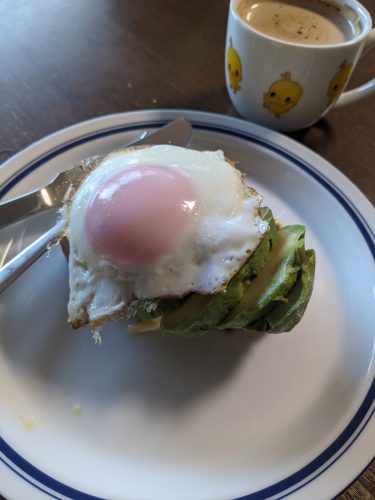 スルッと6時に目が覚めたが、部屋が暗いし寒いのでなんか起きるのが億劫で、ズルズルと1時間ほど布団で過ごしてしまった。その時にぼんやりと、アボカドとパンで朝ごはんにしようと思っていたので、起きてすぐパンを1枚切って、マヨネーズ、ケチャップかけて、昨日半分残ったアボカドをスライスして乗せて、半熟に焼いた目玉焼き乗っけて、オープンサンドを作る。カフェオレもつけて、今日はモーニングっぽく仕上がった。こういうあからさまに食べにくそうなものを、ナイフとフォークでちぎりながら食べるのが好きだ。パンは、みっちりむっちり粉が詰まってるって感じの食べ応えのわりに味わいがさっぱりしていて食べやすい。私はもうちょっとクセがあっても大丈夫だなと思いながら食べている。