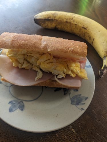やっと腹が軽くぺこちゃんな気がしてきたので、ようやく朝ごはん。こういうとき、甘いものを軽く放り込んで昼にしっかり食うか、朝からほどほどにそれなりにちゃんと入れておくかは、ちょっと迷うところ。今日は後者で。