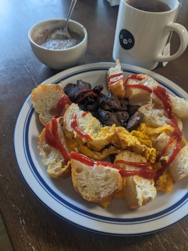 バゲットとレバーソテーと玉子を炒めて朝ごはんに。今日はフレンチトーストにしようと思っていたのだが、昨日飲んだくれすぎて大河ドラマ見てすぐゴロ寝しまったので(スポーツニュースの豊昇龍インタビューは見た)、残り物をさっと炒めてやり過ごす。ごぼうと黒豆のポタージュはレンジでチン。始末料理だがミガスが好きなので、案外ごちそうではある。以前は柔らかさを残しつつ調理することに血道を上げていたなあと思いつつコチコチになった鶏レバーをかじるが、嫌いではない。玉子もふわトロでなくていいし、スパゲッティもアルデンテでなくていい。焼きたてじゃなくてもおいしいパンはおいしい。