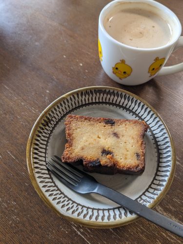 朝しっかりお腹に入れたからお昼はいいかな…と思っていたけど、14時を過ぎると空腹を感じてくる。ご飯チンして、なんか乗っけて食べるかなと思うも、フルーツケーキがあと1切れ残ってたなと思い返して、カフェオレと一緒に食べる。ひとりだと、きっちり3食食べるよりも、2食プラスおやつぐらいがちょうどいいのかなぁ。
