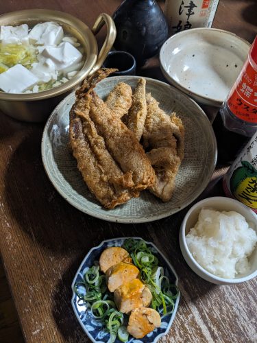 本当は蒸し鶏をメインにする予定だったけど、イワシの開きがお手軽だったので、予定変更。さっと焼いてレモン搾って食べるか、天ぷらにするかだいぶ悩んで、結局天ぷらに。普通に揚げるつもりだったけど、ネットでポチポチ検索してたら土井先生のカレー味が目に留まり、「気取らずウスターソースで」の一文に惹かれて、衣にカレー粉を入れて揚げる。この2つで会津娘の温燗がよく進んだ。意外とイワシの脂乗りが良かったので、白菜と豆腐の鍋が口中をさっぱりさせてくれてナイスだった。