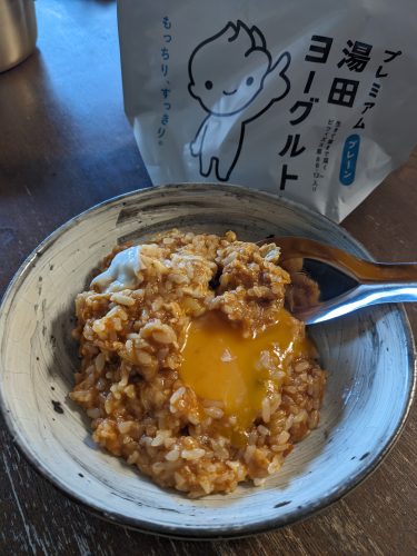 鍋底から1センチほど残ったあんこうのトマト煮の煮汁を温めて、チンしたご飯を入れてなじませて、生卵入れて白身だけ固めたおじや。湯田ヨーグルトの袋に牛乳入れて蓋してガシャガシャ振って作るラッシー。今朝は始末めし。
