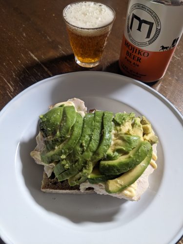 銀座に出て、松屋、三越とはしごして帰宅。せっかく金曜に銀座に出たからとパネッツァのパン(ミラノ)を買ったので、それでオープンサンドに。パンにクリームチーズ塗って、ゆで鶏のスライス、マヨネーズかけて、アボカドスライス。最初はクリチ、アボカド、チキンで乗せたんだけどうまく乗らなかったので入れ替えたので、アボカドが崩れて見た目が悪くなってしまった。しかし、完熟のアボカドはすこぶる美味。ヤオコーのミゲールさんのアボカドはちょっと高いんだけど、ハズレに遭うことはまずないので、やっぱりここで買ってしまう。松屋銀座のチョコレートワールドで、とってもおいしいハイボールを飲んだのだけど、そのおかげでいい感じで飲みたい気分が持続していたので、珍しく今日はビールを開ける。MOJIKO BEERのペールエールは私が350ミリ缶をひとりで飲みきれる数少ない銘柄のひとつ。今日も最後までおいしく飲みきれた。