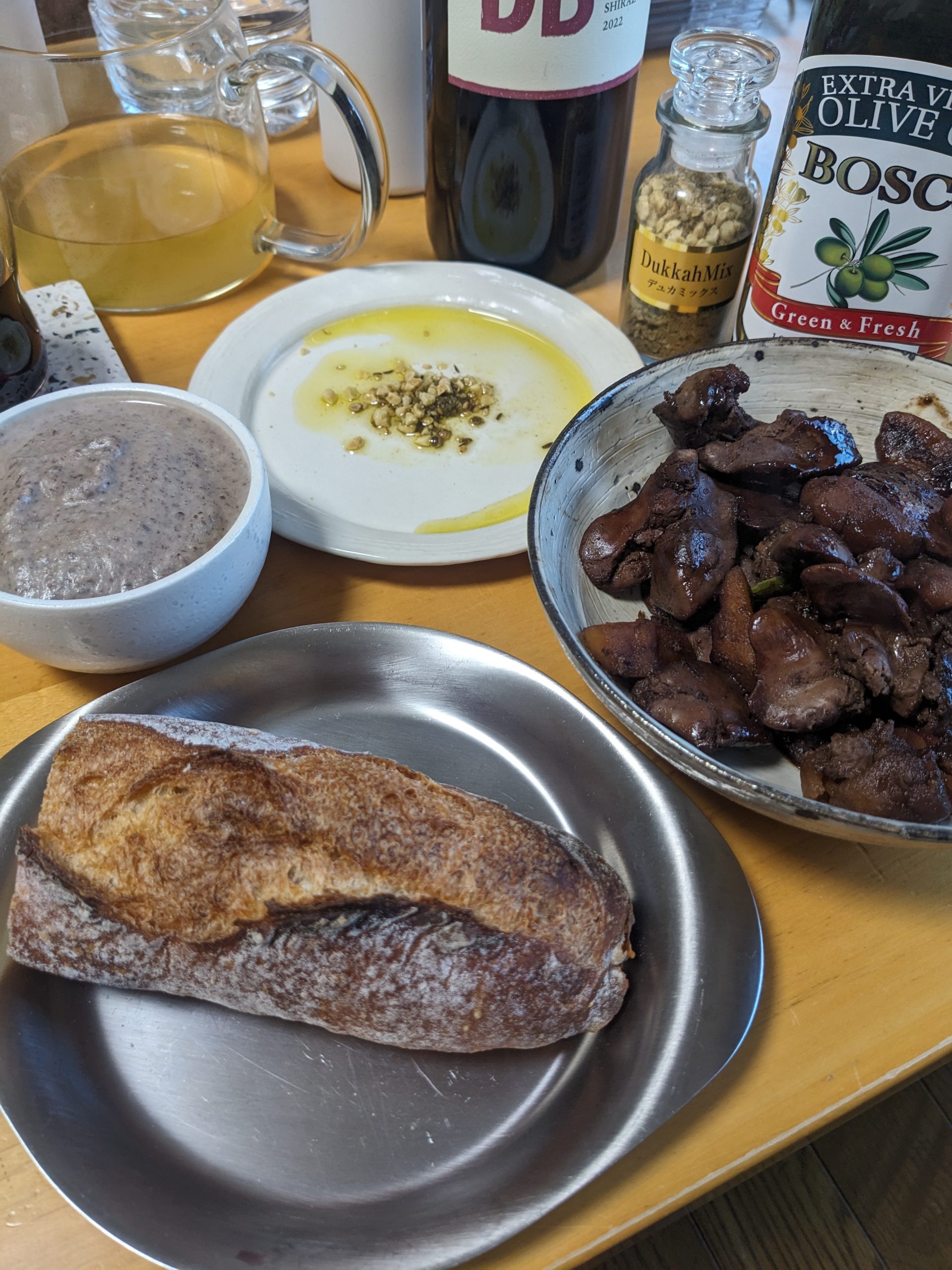 今日の真打、ビゴのバゲットに朝岡スパイスのデュカミックスにオリーブオイルでワインを飲む。脇に控えるは、ごぼうと黒みとり豆のポタージュ、鶏レバーのバルサミコ酢&赤ワイン煮。我ながら軽い赤ワインに最適なつまみで、ナイス献立だ。ちなみに今テレビでは、豊昇龍のアップが流れている。