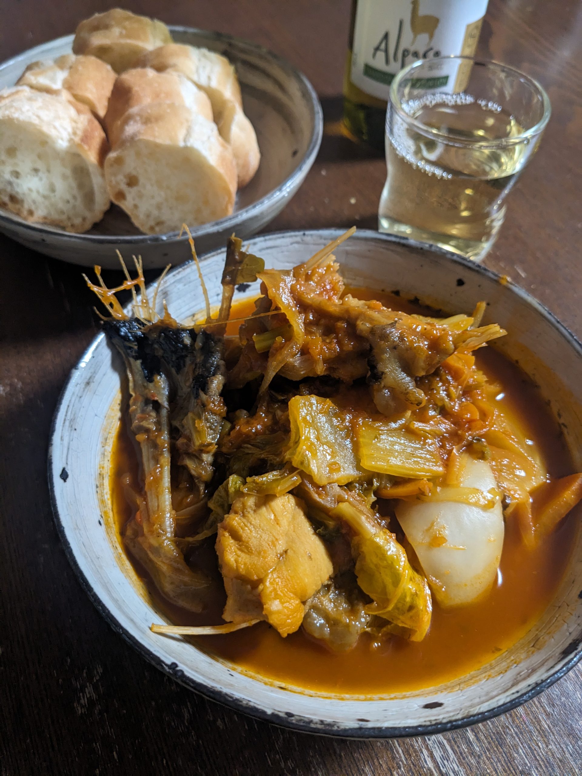 昨日いい感じのあんこうパックを買ってしまい、鍋にするかと思って買ったものの、醤油味にするか、肝入り味噌味にするか、それとも…と考えた中で、トマト味もありじゃねと思ったら、そうだ今こそ賞味期限が切れても大事に持っていたフュメドポワソンの缶を開ける時だ! あと、同じく賞味期限が切れたまま捨てずにいた未開封のサフランもここで使うべきだろう! と連想ゲームのように思い浮かび、なんちゃってブイヤベースを作ることに。オリーブオイルで玉ねぎとニンジンを炒め、作り置きのソフリットを加えて白ワイン。煮詰まったらフュメドポワソンと水で戻したサフランを入れて、かぶ、白菜、沸いたらアンコウを入れて、20分ほど煮込む。本当のブイヤベースは具としての野菜は入れないみたいだけど、もともと鍋の予定だったんだからと白菜とかぶも入れたら、このうまい汁を吸い込んでいずれも大変美味でした。ルイユはパス、代わりにガーリックトーストにしたいところも我慢したけど(明日人に会うので)、美味しかったので問題ないです。