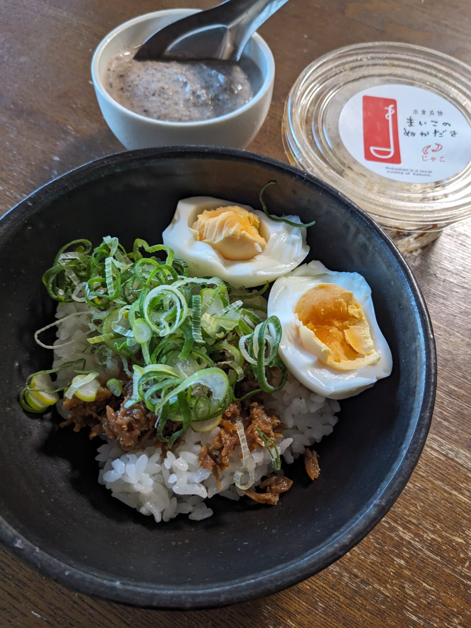 昨日は布団に入ったのがちょい遅く(1時半)、すぐ眠りに落ちる予定だったのだけどなかなか眠れず、果ては空腹で余計に目が覚めるなんて事態で、明日の昼は何を食べるかなあと考えて余計に目が覚める始末(それでもいつの間にか寝落ちしてたんだけど)。おかげで珍しく、起きたらすぐにレンジでご飯をチンした。味噌汁作るのももどかしく、ごぼうと黒みとりのポタージュを汁物代わりに。じゃこのぬか炊きは初めて買ったんだけど、これはかなり好きな味。九条ネギがよく合う。