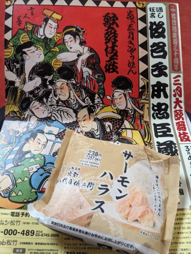 幕間ごはんはセブンのサーモンハラスおにぎり。米で勝負するタイプのおにぎりで、海苔はなし。海苔好きの私からすると残念なのだが、コンビニのおにぎりの海苔には特に思い入れはないので、まあよし。お米は確かに他のおにぎりよりおいしいのだけど、サーモンハラスがすごくハラスっぽい脂の塊で、なんというか食後少し胸焼けした。最近コンビニのおにぎりで何も思わずに食べたことがほとんどないので、色々大変なんだろうなあとは思う。今日の歌舞伎はものすごい久しぶりの忠臣蔵で、まだ3日目だからというのもあるとは思うのだけど、高い席から安い席までお客さんがびっしりで、さすが忠臣蔵、大盛況という感じ。老齢男子のおひとり様とか、普段全然歌舞伎なんか観ないけど忠臣蔵かぁ、昔招待券で行ったことあるんだよ、久しぶりに歌舞伎座行ってみるかって感じの老夫婦とか、そういう普段は見かけない感じの客も多くて、わざわざ新作で若い人を掘り起こさなくても、まだ狩場はあるのかもしれない、と思った。