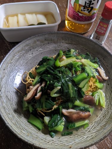 朝ごはんを食べた後、お腹の具合があんまりよろしくなくなって昼ごはんはパス。夕方何となくせんべいをつまんだものの、どうもしっかりご飯を食べる気にはなれず、ちょうど食べ切らなきゃいけない皿うどんがあったのでそれで。具は中途半端に残ってしまっていたしいたけと小松菜。普段は1人前をふたりで分けて食べているので、ひとりで1人前食べるのは新鮮だった。あんかけもひとりで1人前使ったけど、パッケージ通りに作ると少し味が濃かったので、酢をドバッとかけて食べた。