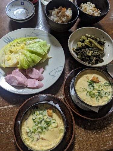 賞味期限が切れたばぁばぁのかしわめしがあるから、夫のいるうちに使ってしまわねばと今日ご飯を炊く。ご飯が主役だから相手はあっさりいこうと茶わん蒸し。というか、魚河岸揚げが2個残っていて、これどうやって食べようかなぁと考えて思いついたという方が正解かも。他に干しシイタケのスライス、青ネギを入れて、うどんつゆを出し代わりにして作る。茶わん蒸しを蒸すついでにキャベツも入れて、それで一品。明宝トンハム添えてマヨポンで食べる。太宰府で買ってきた高菜の塩漬けを開けてみたが、すごくおいしかった。
