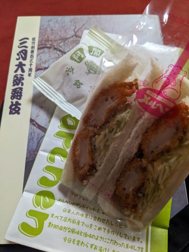 歌舞伎座に行く前に三越のメルヘンに寄ってイカフライサンドを買う。メルヘン一番好きなのは玉子サンドだけど、それ1個だとちょっともの足りず、さりとてもう1個別のを買うとちょっと食べ過ぎで、何を足せば大満足なのかまだ見つけきれていない。今日のイカフライサンドはすごくおいしかった。帰宅するまでいい感じでお腹が持ってくれたのもありがたくて、これはまた買うかも。菓遊庵に寄って、まだエキソンパイがあったので1袋買い、ついでにたまたま売ってた阿闍梨餅をひとつ買う。すごく久しぶりに食べたけどおいしい。でも高くなったなぁ。最近は何を食べてもそう思うのだけど。