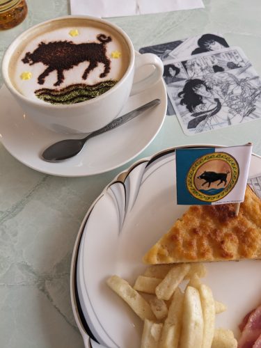 グッズもなかなかアツくて、ジェイムス君の「暴利を貪る」ポーチはギリギリまで迷ったが、見送った。ステッカーだったら即買っていたな。グッズ化といえば、私が好きなコマは、伯爵が「見てくれ少佐、私の社会復帰した姿を」なんだけど、これをステッカーにしたらほとんどの人が絶対買うと思うし、何より自分が欲しいので、密かに切望している。青池先生の原画だけで目一杯堪能したので、常設展示である夢二は今回はパス。敷地内にある港やという喫茶店でコラボメニューであるカルトフェルトルテとカプチーノを注文する。この2つを頼むとコースターが貰えるので問答無用で注文。ケーキは案外数がないらしく、遅く行くと売り切れていることもしばしばらしいが、昼時ともあって周りのお客は全員カレー(食事メニューはこれしかない)を食べていたので無事注文することができた。カルトフェルトルテは実はマッシュポテトを固めたようなものかなと勝手に想像してたのだけど、全くもって素朴な焼き菓子のようなケーキだった。そんなに難しくなさそうなので作ってみようと思う。