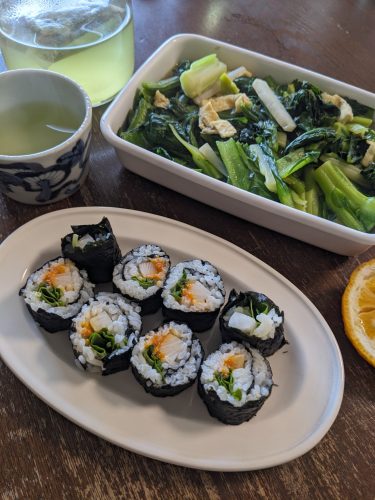 最後に少し残った一汐うにをどうやって食べようかなぁとずっと考えていて、ご飯と合わせるのがおいしいし、うには海苔との相性が抜群だから、うにともみのりのっけ丼でいいかと考えていたけど、もうちょっとさっぱり食べたいと思って海苔巻を作ってみた。ご飯には、阿波すず香という柚子とすだちを掛け合わせた柑橘搾り汁を合わせて酢飯にした(ご飯100グラムに阿波すず香半分)が、とてもよい。すし酢は自分で作ると本当にぎょっとする砂糖と塩なので、ぜひ全人類一度は自分で作ってみてほしいと思うが、すし酢のうまさは認めた上で、酸味だけ作る酢飯のうまさもなかなか乙だと個人的には思う。この酢飯を海苔に広げ、大根を芯にして、一汐うに、ルッコラを少し忍ばせる。この組み合わせはなかなかよかった。久しぶりに頭であれこれ考えていたのがスパンとはまった感じで嬉しい。小松菜と揚げの炒め煮を味どうらくの里でさっと作って、玄米茶で食べる。この冬は小松菜は、ちょっと高いなーとスルーし続けた結果、あんまり食べなかったなぁ(白菜も)。もうトウが立ったのばっかりで、これからは菜花の季節だな。