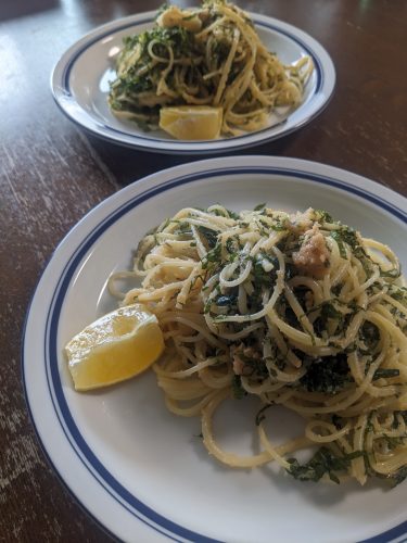 昨日スーパーでアホみたいに安い青じそがあったので買っておいたのだけど、夫が明太子パスタいいねというので、早速使う。1束が最近の1束の1.2倍位あって、しかも2束で99円。残してもしゃーないと全部使った。パスタはディ・チェコの1.4ミリが60グラムくらい残っていて、それにeatime の1.9ミリを70グラム足して時間差で茹でる。eatime は茹で時間は10分とあるのだけど、数回食べてどうも好みの感じではないので今回は12分茹でることにして、6分茹でたところでディ・チェコを投入する予定だったのだけど、うっかり8分経過してしまって、仕方なく全体の茹で時間を2分伸ばした。なのでeatime は推奨よりも4分も茹でることになってしまったけど、結果的には特に問題はなかった。明太子は半腹で94グラムというビックサイズだったのだけどさすがに全部使うわけには行かなくて、45グラム使用。それでもまあまあ大盤振る舞い。ボウルに、オリーブオイル大さじ2、白すりごま大さじ1、薄口しょうゆ少々、にんにくすりおろしちょびっと、そこにゆで上がったパスタを入れてざっと和え、刻んだ青じそを加えて大きく混ぜる。あんな山盛りの青じそが一瞬で縮むのを見ると、後乗せしたほうがよかったかなと一瞬思ったけど、ほんのり火が通ったほうが口当たりがよくておいしいはずだ…と言い聞かせながら器に盛って、カットレモンを添える。うれしいことに今日のはやたらとおいしかった。いつもの手順で作っているだけなのに、なんでだろう。