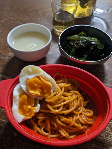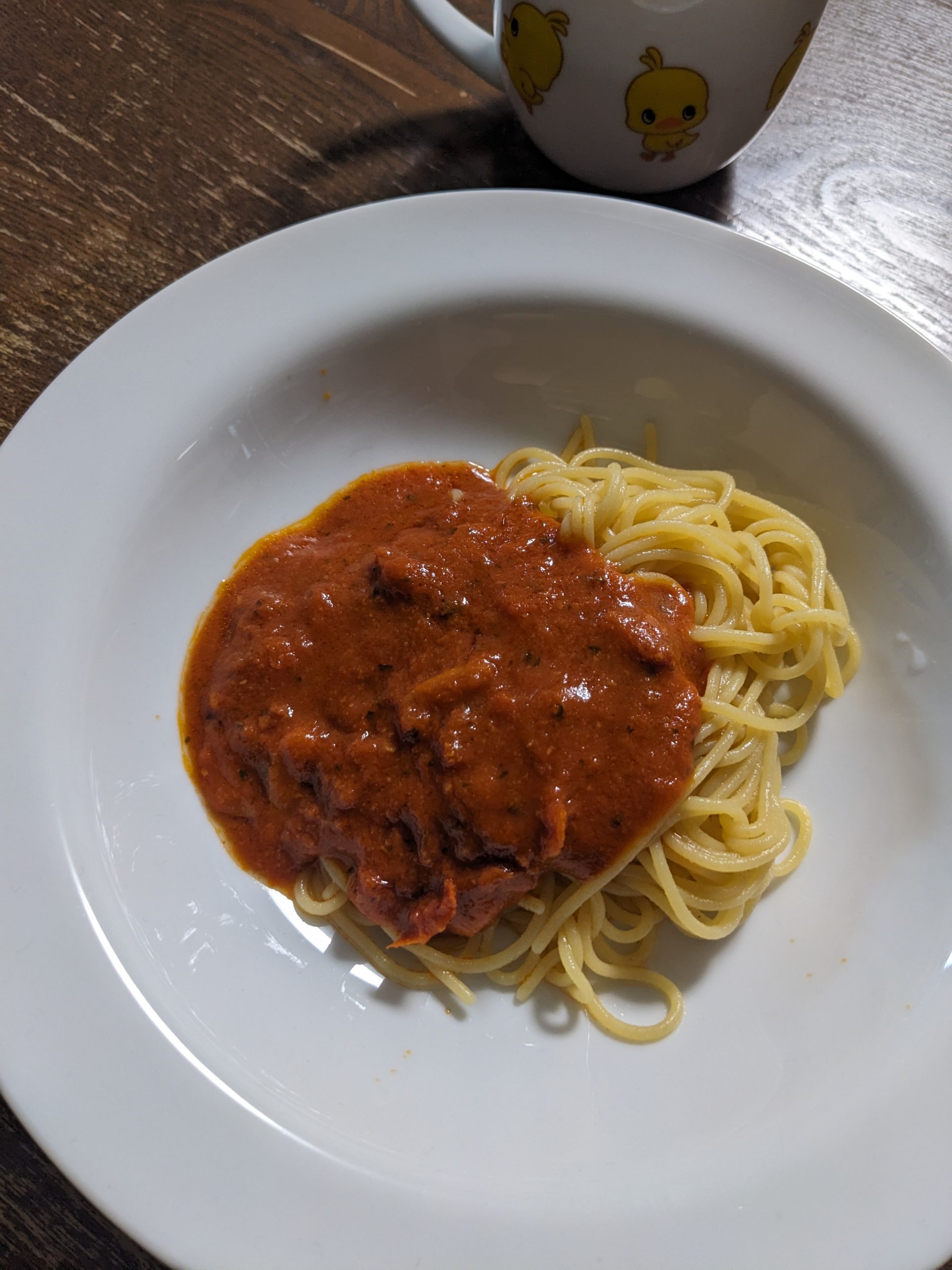 思いの外仕事が終わらなくて、一段落したのが8時半。久しぶりに脳みそ動かして死んだ。もともとキムチチゲを作るつもりだったのだけど、今から作るのダルいな、冷蔵庫にいわしの梅煮があるけどご飯がないな、外に食べに行くのも面倒だな、と色々考えた末に、パスタソースを半分残してあったのを幸い、お昼と同じものを作って済ませてしまった。塩なしで茹でたので茹で汁を汁物代わりに添えてみたけど、想像通り十割そばのそば湯っぽかった。戻しておいたワカメだけはどもならず、キッコーマンのステーキソースをかけてサラダ代わりに食べた。最初は疲れてる時にご飯の用意つらいなと思ったけど、手を動かしちゃうと案外なんかなるもんだ。