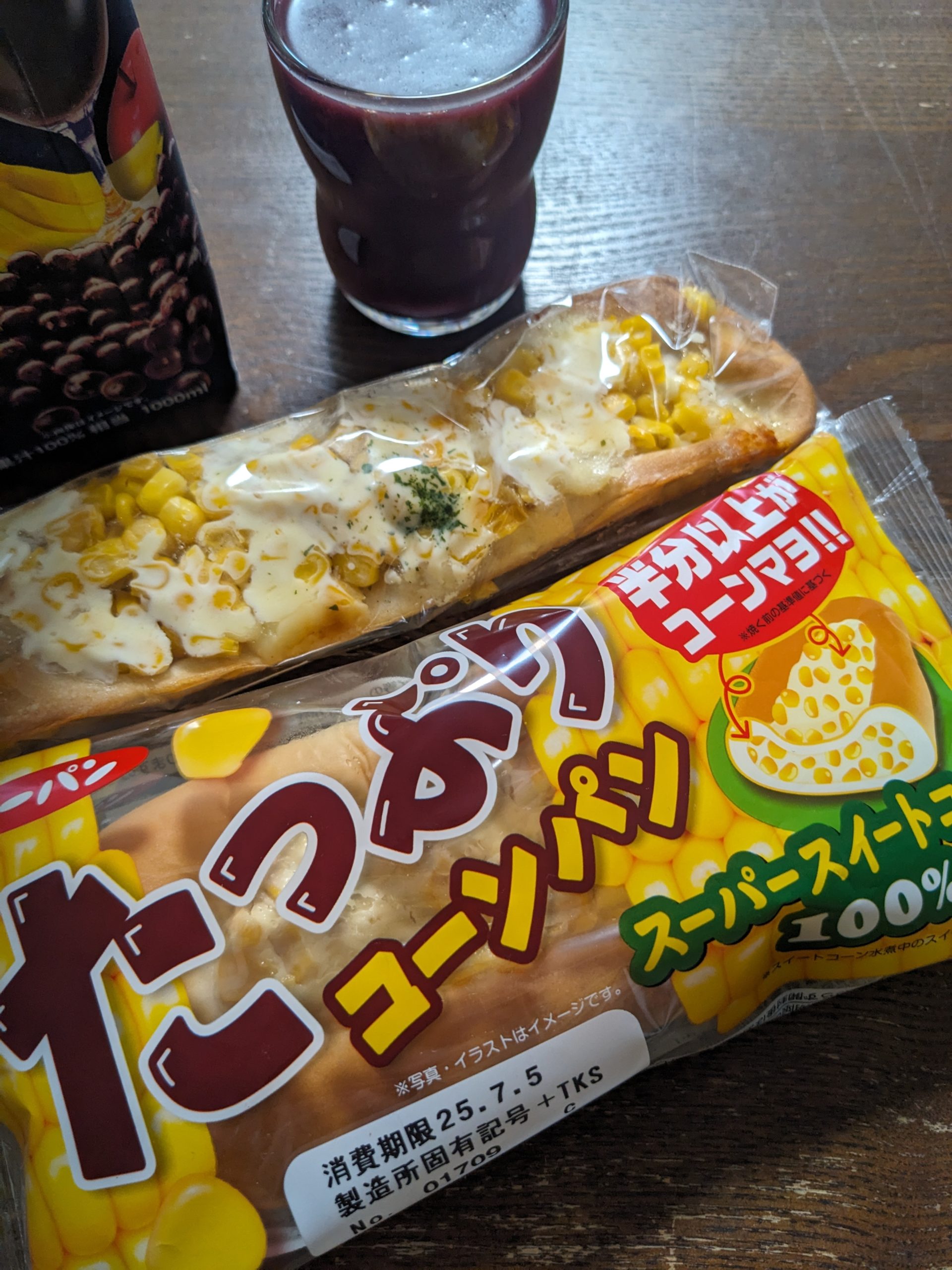 歯医者帰りにスーパーに寄って、惣菜パンコーナーに第一パンの「たっぷりコーンパン」が山積みされていたのでカゴに入れ、1個じゃ足りないかなとヤオコーのお弁当コーナーの「コーン好きのコーンマヨパン」も買う。食べ比べるとコーンマヨパンと言えどもメーカーが変われば味はだいぶ違うんだなぁと感心したが、それよりも第一パンのパッケージを見ると、「半分以上がコーンマヨ!!(※焼く前の基準値に基づく)」とか「スーパースイートコーン100%(※スイートコーン水煮中のスイートコーン占める割合)」とかいちいち注釈が打ってあって、大手メーカーは大変だなと思った。第一パンのコーンマヨパンはノーマルな味だったけど、ヤオコーの方はそれに比べると結構塩気が強くて、でも塩分量は第一パンの方が0.5グラムも多いのがなんとも不思議だった。しかし2個は食べすぎたな。