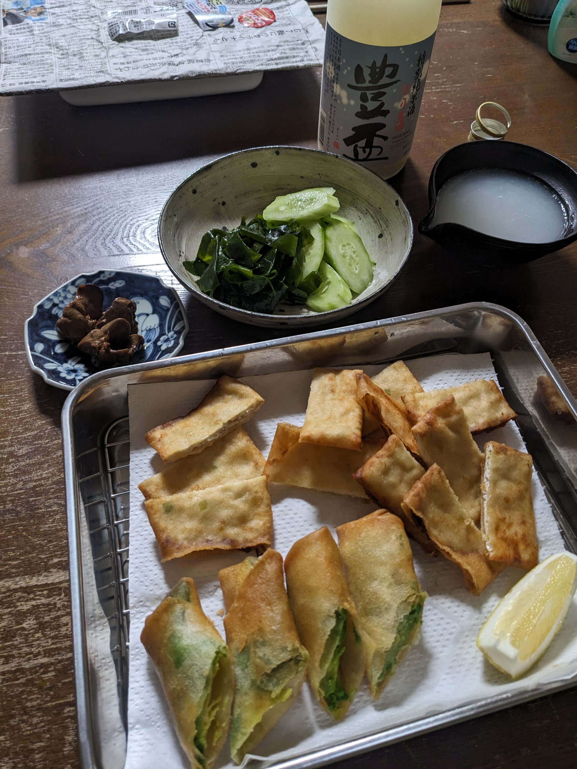 すぐ終わると思った作業が意外と時間が掛かって、なんだか中途半端な時間になっちゃったなぁと思いながらお稽古をやって、調子づいていつもより長く弾いていたら、ちょっと凝った晩ごはんを作るには遅い時間になってしまった。でもなあ、春巻きは1回作っとこうと思ってたし、今日は材料も買ってきたからやっぱり作ろうと、風呂から上がって、8時過ぎてから取り掛かる。アボカドの春巻きと、鶏ひき肉の春巻き。合間に、きゅうりの塩もみと塩蔵わかめの塩抜きやって、鶏レバーソース煮も作る。春巻きはどっちも良かったけど、アボカドよりも鶏ひき肉のほうが収穫だった。春巻きというよりチキンナゲットっぽい味わいで、フライパンで揚げ焼きすればいいところもお手軽で良い。食べ始めが9時過ぎで、こんなカロリーの高いものよくないなと思いつつ「刑事フォイル」を見ながらペロッと食べて、父親が日本酒を2本送ってきていたので少し開けたのもあって、ソファでうとうと。休憩を挟みながら、洗濯やって、砂抜きしていたアサリを冷凍して、お皿をシンクに持っていくところで力尽きて横になったが、下腹部と背中と両方痛くて目が覚めて、しくしくしながら布団で横転を繰り返す。ちょっとびっくりな痛さだったが、たぶん、今週はずっとあんまり出歩かずに涼しい部屋にいたので内臓が動かなくなっていたのだと思う。そこへガッツリご飯食べてお酒も飲んだので過剰負担になったのだろう…と思われた。痛みが治まったのが5時で、そこからまだらに寝ていて、もう昼近く。夫からは今日は何もないですと言われたので昭島に映画でも見に行こうかなと思いつつも、暑いし、再来週の旅行でお金使いたいしな、とか考えると、やっぱり家でごろごろしているのが最適解な気がしてきた。