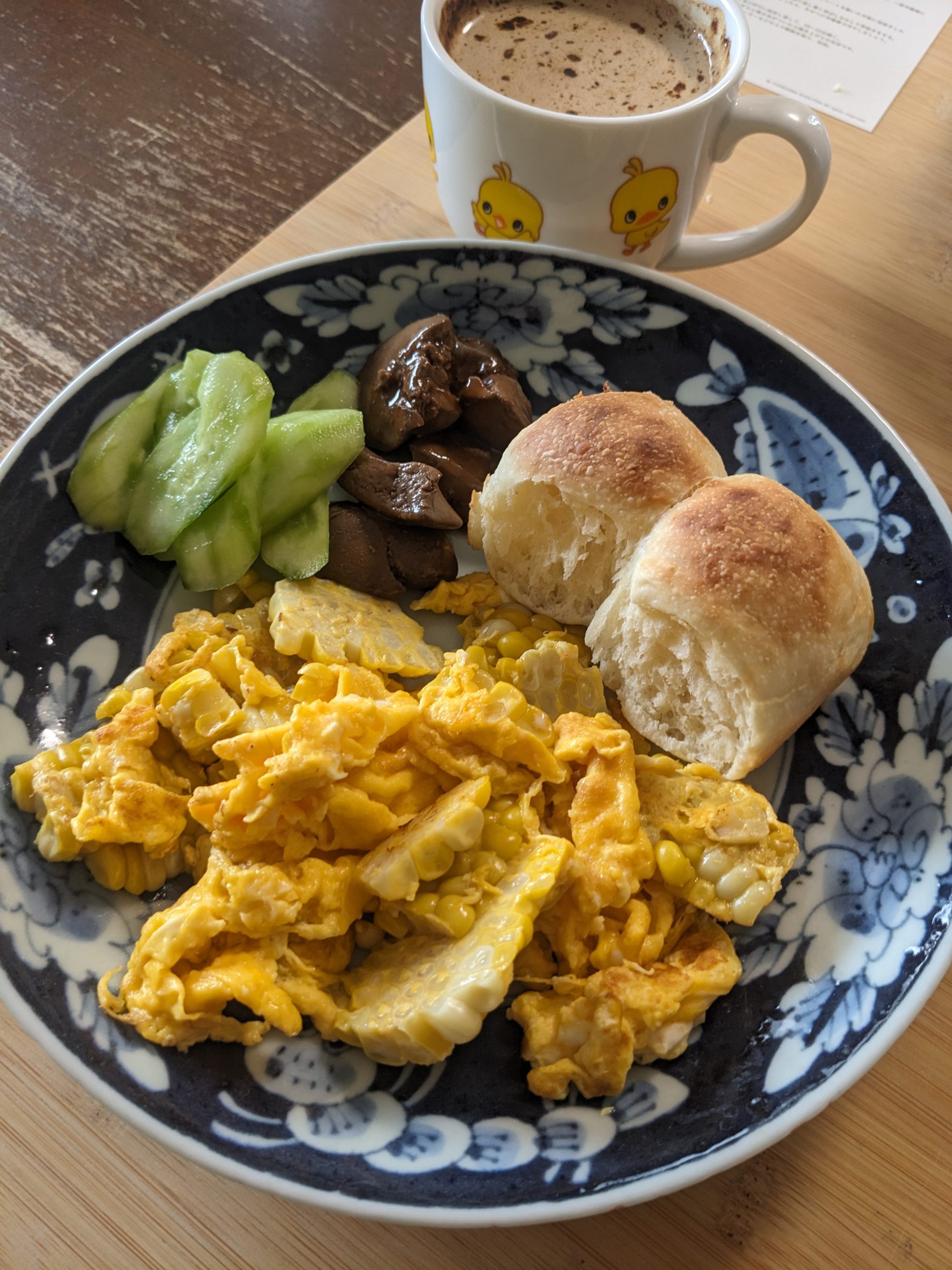 今日は5時半のめざましでパチっと目が覚めた。この1週間、夜の空調を試行錯誤していたのだけど、昨晩試した「28度でつけっぱなし、風は左右上下に動かす」はドンピシャでハマった感じがする。今日もこれで寝よう。早起きできたからさっさと起きればいいのに布団でうだうだ新聞や本を読んで、起き出したのは7時過ぎ。アホだな…と思ったが、ここ最近では一番健康的な目覚めだったのは喜ばしい。これも最近気づいたのだが、部屋は明るいほうがやる気が出るので、気づいてからはリビングの天井灯は2つとも昼から全開でつけている。薄暗いとどうも気分が落ち込みがちだ。健康ついでにしっかりご飯も食べた。昨日蒸しておいたとうもろこしの実だけそいで玉子と炒めたもの、作り置きの鶏レバーのソース煮、きゅうりの塩もみ、ちぎりパン、ホットミルクコーヒー。昨日たまたまロイヤルホストのモーニングメニューを見ていて、朝からこんなに食べれんわなと思っていたのだが、今日の朝ごはんは結構負けていない。ちぎりパンは冷凍したのを一晩冷蔵庫で解凍してオーブントースターで5分焼いたもの。ちょっと目詰まりしていたが、おかずに添えるには十分だった。夫からLINEがあって、再来週の雲仙行き、前泊しないかという。思いも寄らない提案だったが、ひょっとするとぼんやり興味のあった熊本市街を散策するチャンスかもしれないと思い、早速、吉元由美と田尻久子の『熊本かわりばんこ』というエッセイを買った。