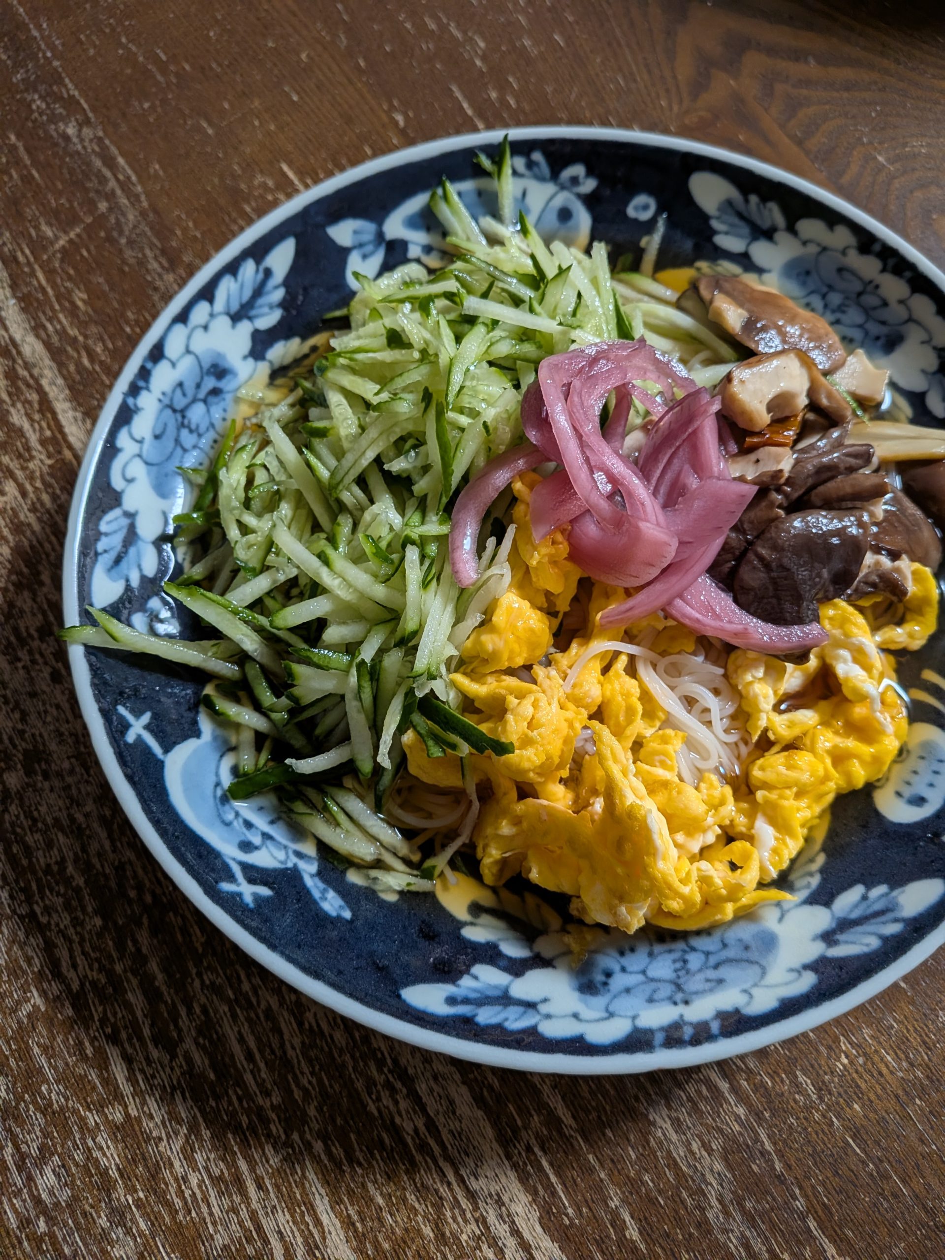 朝から出掛けていて昼に帰宅する夫を待っていたのだけど、念のために確認LINEしたら「やっぱり食べて帰ります」と来たので、ソッコーで簡単な昼を作って済ませる。そうめんは大好きだけど、そうめんのままで食べると食後に絶対眠くなるので、野菜の具をたっぷり乗っけたぶっかけで食べるに限る。スライサーでおろしたきゅうりが最高で、これと玉子の組み合わせはゴールデンコンビだと思う。栄養的にも色合い的にもいい。次点は揚げ玉でこっちのほうがよく作るけど、今日はほどほどやる気が残っていたので炒り玉子を作った。本当は丼に入れて、甘しょうゆとラー油を回しかけてよーく混ぜる汁無しそば仕立てで食べるのが一番いいのだけど、今日はなんとなく気分で少なめのめんつゆをかけて汁そば風で作った。これもおいしいけど、ズルズル食べてしまうので、やっぱり食後は少し胃がもたれるのだった。