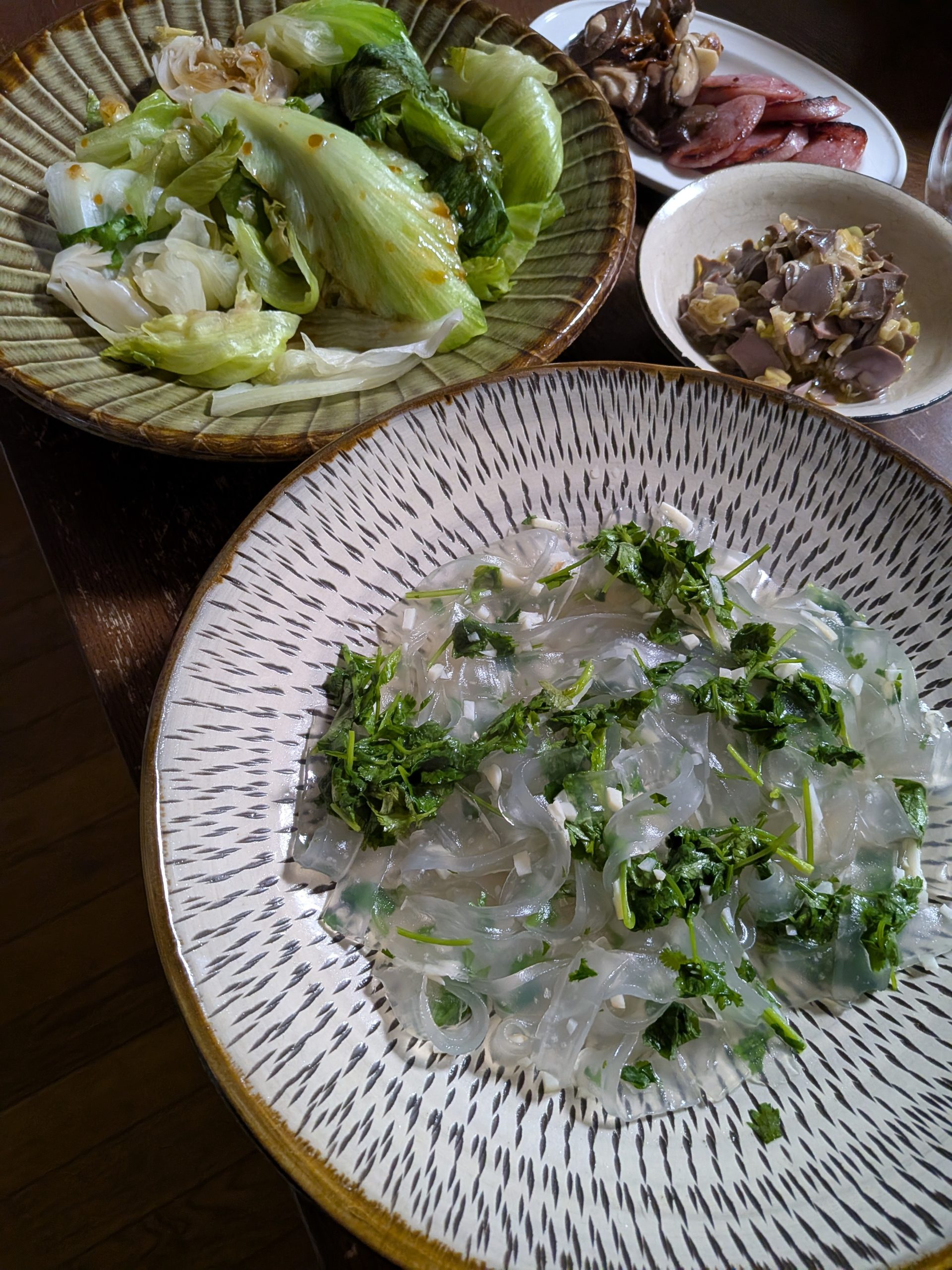 昨日手頃な香菜があったので買っておいて、それで太春雨の炒めものにした。早く食べなきゃいけないにんにくもあったのでちょうどいい。1玉98円のレタスも買っていたので無限消費レタス。1玉食べ切る気満々だったけど茹でる最中に思い直して4分の1は残した。レタスって意外とおなかの膨れる野菜で全部茹でなくてよかったと思った。オイスターソースはあんまり濃くないほうがいいかなと思ったけどレタスから水分が出るのでもうちょっとガツンとした味でも良かったかも。夫にはゆで砂肝のオイポンドレ和え。私は雲仙ハムを切って焼いたのと昨日のしいたけ炒め。雲仙ハムはレトロなプレスハムなんだけど、私が普段口にするものよりも味が甘めな気がした。やっぱり九州だからだろうか。