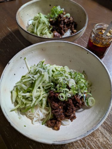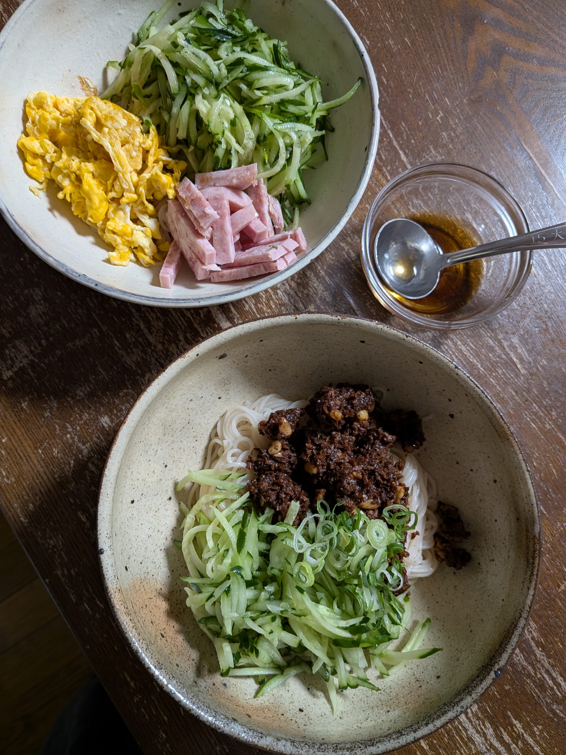 火曜日にしいたけをたくさん買ったので、しいたけの軸がたくさん残った。若い頃は捨てていたが、有元葉子さんの本で「しいたけはむしろ軸のほうがおいしいと」いう一文を読んで以来捨てられなくなってしまった。使い切るアテをいろいろ考えたが今回は肉味噌にねじ込むことに。もともと八丁味噌を大量に使う肉味噌を作ろうと思っていてレシピをとっておいたはずんだけど探しても見つからず、仕方ないので適当に作る。しいたけの軸、にんにく、しょうがをフードプロセッサーで粉々に砕き、油で炒めたら豚ひき肉赤身100グラム、松の実大さじ1を加えてよく炒め、合わせ調味料(八丁味噌大さじ2、きび砂糖小さじ1、酒大さじ2、水50ミリリットル)を加えて軽く煮込む。出来上がりは240グラムになった。ゆでて水にさらしてよく絞ったそうめんに、肉味噌、千切りきゅうり、九条ねぎを乗せてよく混ぜて食べる。私はラー油も。このジャージャー麺もどきは私の実家では夏によく出た料理のひとつだが、実家だと米味噌を使い刻んだ長ネギ(青いところ)がたくさん入ることが多く、なんというか飯に合う味であった。そういうのも作るが、八丁味噌で作る肉味噌の方が麺(特に中華麺)にはよく合うと大人になった私はそう思う。麺はズルっとスルスル食べてしまうよりも、具と一緒にゆっくりもぐもぐ食べるスタイルのほうが好きだなので、今日のは私にはいい昼だったと思う。こういうぐちゃぐちゃによく混ぜて食べる料理は夫はそんなに好まないので少し心配だったがおいしいと言っていたのでよかった。食後に熊本のスイスで買ってきたバウムクーヘンを食べる。ローマジパンと香辛料(シナモン、ナツメグ)が入るところが珍しく、レトロな感じもあるが、私は好きな味だった。