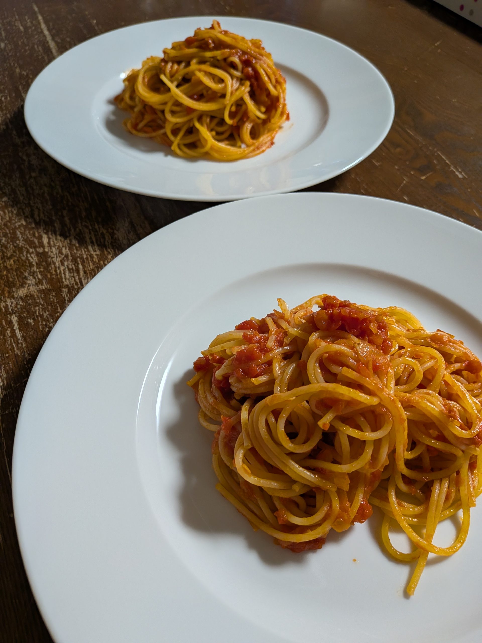 食べるものがないあまりない。あるといえばあるが、微妙に足りない。とんこつラーメンの袋があるけど紅しょうががないなぁとか、にゃく焼き作ろうかと思ったけど紅しょうが揚げ玉がないなぁとか、明太子パスタいいなぁと思ったけど青みがないとか、夫はそうめんでいいと言っていたけど私は麺だけじゃ食べられないので具が欲しいが乗っけられるものがない。ご飯炊いて混ぜご飯と味噌汁も考えたけど、夕方にお寿司食べるのでご飯は避けたい。それにクソ暑い時間帯に買い物に出るのも嫌だ。色々思いついては消しを繰り返して、トマト缶があるのでトマトソースのパスタにしようと思い至った。ソフリットあったらラクなのになと思ったがないので、玉ねぎ4分の1、にんにく1個をみじん切りしてオリーブオイル大さじ3でじっくり炒める。玉ねぎ臭さが感じなくなったところでトマト缶、ローリエ1枚を入れて15分ほどゆっくり混ぜながら煮込む。一般的なレシピではここで塩を入れて味をつけるが、私は味はつけない。昔はここでムーランにかけていたが、面倒なので今日はここでおしまい。1リットルに粗塩大さじ1を入れた湯でパスタを茹でて、ゆで上がったら、テフロンのフライパンにトマトソース140グラムを取り分けてパスタゆで汁大さじ2でのばして(ここでソースに塩味をつける)温めたものの中に投入してしっかり和える。麺に塩味が付きすぎていたらお湯を、そうでなかったらゆで汁を加えてソースの濃度を調節する。今日はソースだけなのでパスタは1人前70グラム。細麺なのが悔やまれるがお手軽でこれも良い。久しぶりに作った思ったが、トマトソースにはにんにくはなくていいなぁと思った。あとオリーブオイルももう少し減らして良い。トマト缶の段階でムーランにかけるのはありかなとは思った。最近荷物になるのでそんなに買わないのだけど、やっぱりおいしいトマト缶は少し買い置きしておきたいなと思った。食後に長崎次郎喫茶室で買った清正公ブレンドを入れ、火の国フロマージュを半分こした。あんパイも好きなのだけど、宮崎発祥のチーズ饅頭も密かに気になっていてちょいちょい食べているのだけど(あと、ホイル蒸しケーキと鳥型サブレ)、これは結構おいしいと思う。
