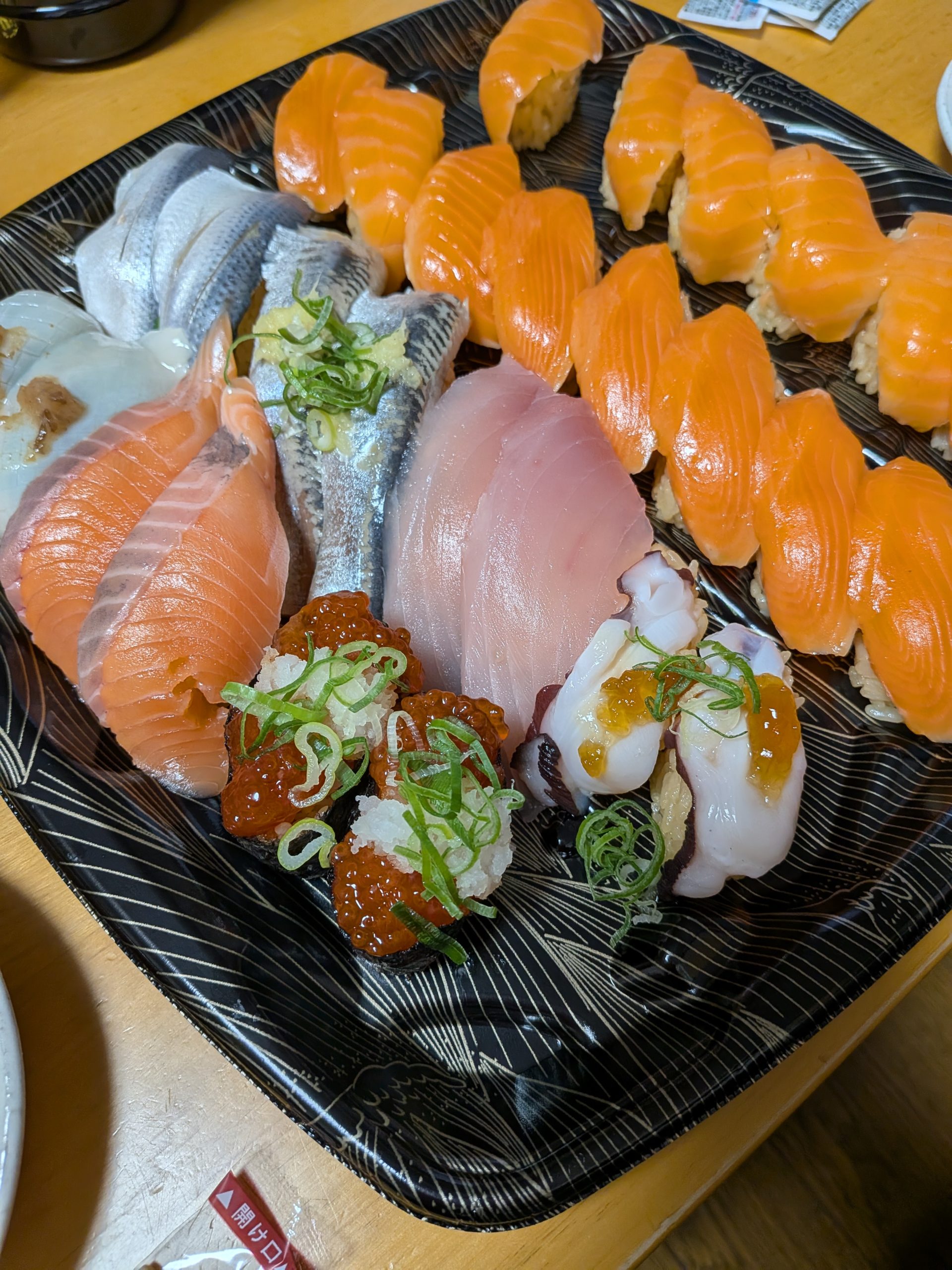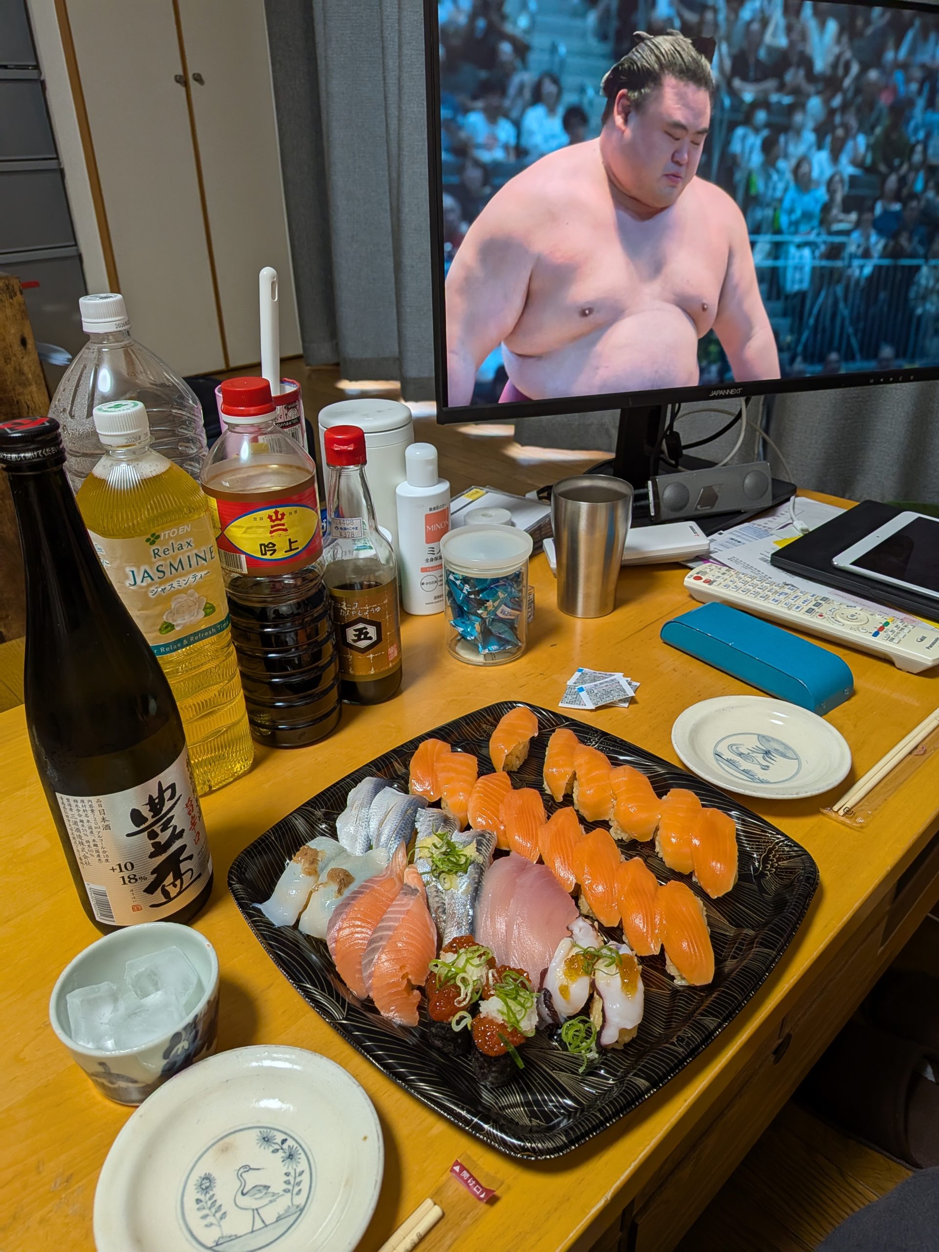 大相撲の千穐楽なので晩ご飯は早めのくら寿司。15時半に引き取って帰宅し、相撲中継を観ながらダラダラつまむ。お店だと4皿(8カン)で納めようと意識が働くのだが、持ち帰りだといつも7〜8皿頼んでしまう。夫が煽るというのもあるが、実際家だとそれくらい食べられてしまうのだから不思議だ。今日は水ダコポン酢ジュレのせ、いか梅肉のせ、こはだ、いわしねぎショウガのせ、大切りビンチョウマグロ、ます、すじこ軍艦。ますとすじこは前回食べておいしかったので今回は準備よく2皿(1皿1カンだったので)注文。さすがに14カンは少し多かったかと思いつつ、好きなネタばかりなので最後まで美味しく食べてしまった。夫は前回やって楽しかったということで今回もサーモンオンリー(14カン)。今日は本割りで琴勝峰が優勝を決めてしまったのでなんだか大して盛り上がらず、高安や大の里も今更格下相手に強さを見せてもなーという感じもあり、私的には微妙に白けた千穐楽ではあった。ただ、玉鷲は今日も勝って11勝、殊勲賞も取ったのでよかった。食後についうっかり堅揚げポテトの焼きもろこし味食べたのだが、失敗だった。堅揚げポテトは定番以外はおいしくないということをいい加減肝に銘じるべきと改めて思った(ゆず塩レモン味と焦がしチーズと黒胡椒味は例外)。