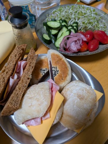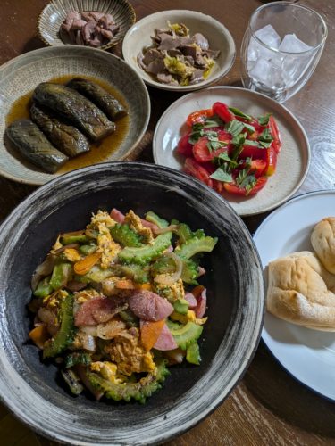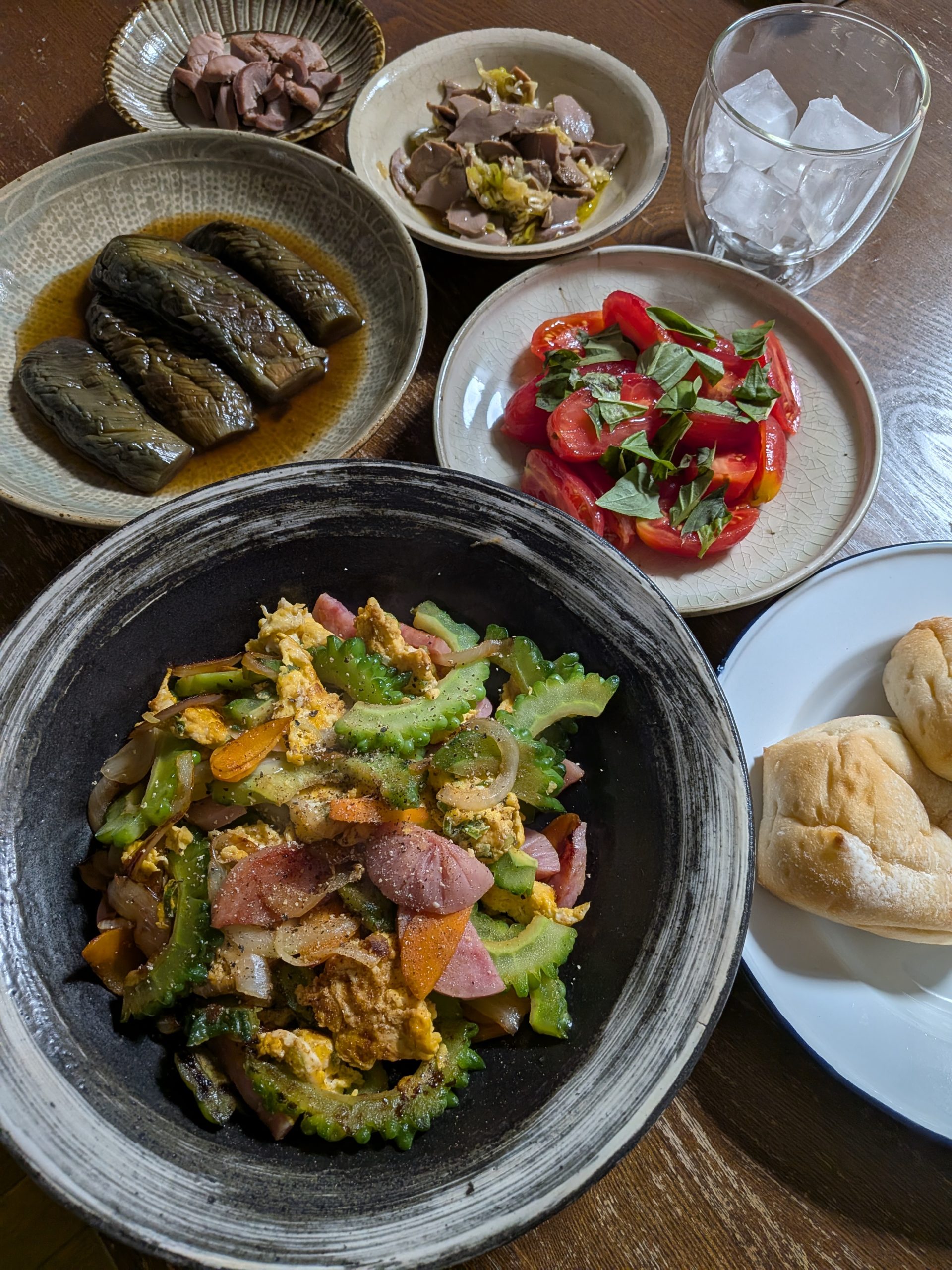 あんなにあったお菓子を食べ尽くしてしまったので、朝はカロリーメイト。お稽古日なので昼はハムチーズパンとサラダ。いつもはアルファルファだけど、昨日仕込んだアイコトマトの湯剥きときゅうりをメインにしたかったので、今日はブロッコリースプラウトを1パック。久しぶりに食べたけどやっぱり辛い。パンは夫にはキィニョンの王様のロールパン、私はパスコのシードブラウン食パン。王様のロールパンも好きなんだけど最近だいぶ小さくなったのでなんだか寂しいなーという気持ちのほうが先立ってしまい、最近は違うパンのほうが食べたい気分になる。今日のブラウン食パンはまあまあよかった。までクリームパンはお休みだから今日はあんぱんで。お稽古日は砂肝も買う日。今日は肉の日なので2割引きでグラム80円。いつも通り400グラム買ってオイポンドレ和えにする。今日は最後のスライスの方向をランダムにせず、繊維に沿ってスライスすることに揃えたら、夫がいつもと違う、柔らかいというので、なるほどなーと。以前食べ比べしてもらったときにそんなに違いが分からないと言っていたこともあって、あんまりスライスの方向にはそれほど気を使ってこなかったんだけど、食感を揃えるのもアリだと分かったのは新たな発見でなんかよかった。昨日のゴーヤー炒めに使ったゴーヤー、玉ねぎ、にんじん、雲仙ハムに玉子をプラスしてまたゴーヤーチャンプルー。やっぱり玉子が入ったほうが全体のなじみが良い気がする。昨日は甘しょうゆだけで味付けしたが強かったので、ほんだしを少し振ってから甘しょうゆ小さじ1で。やっぱりゴーヤーチャンプルーは薄味プラス加工肉の塩気で食べるのがおいしいと思う。少し太めにスライスして浅く火を入れたゴーヤーを齧るとじゅわっと苦い汁が広がるのがなんとも体に染み入る感じでうまい。夏のうちにもっと食べておかねば。相撲が終わって少し寂しいが、終わったおかげでBSP4Kの海外ミステリードラマがまた観られるのはまあよかったかな。しかし今日の「殺人は容易だ」はなかなかのイヤミスっぷりであった。