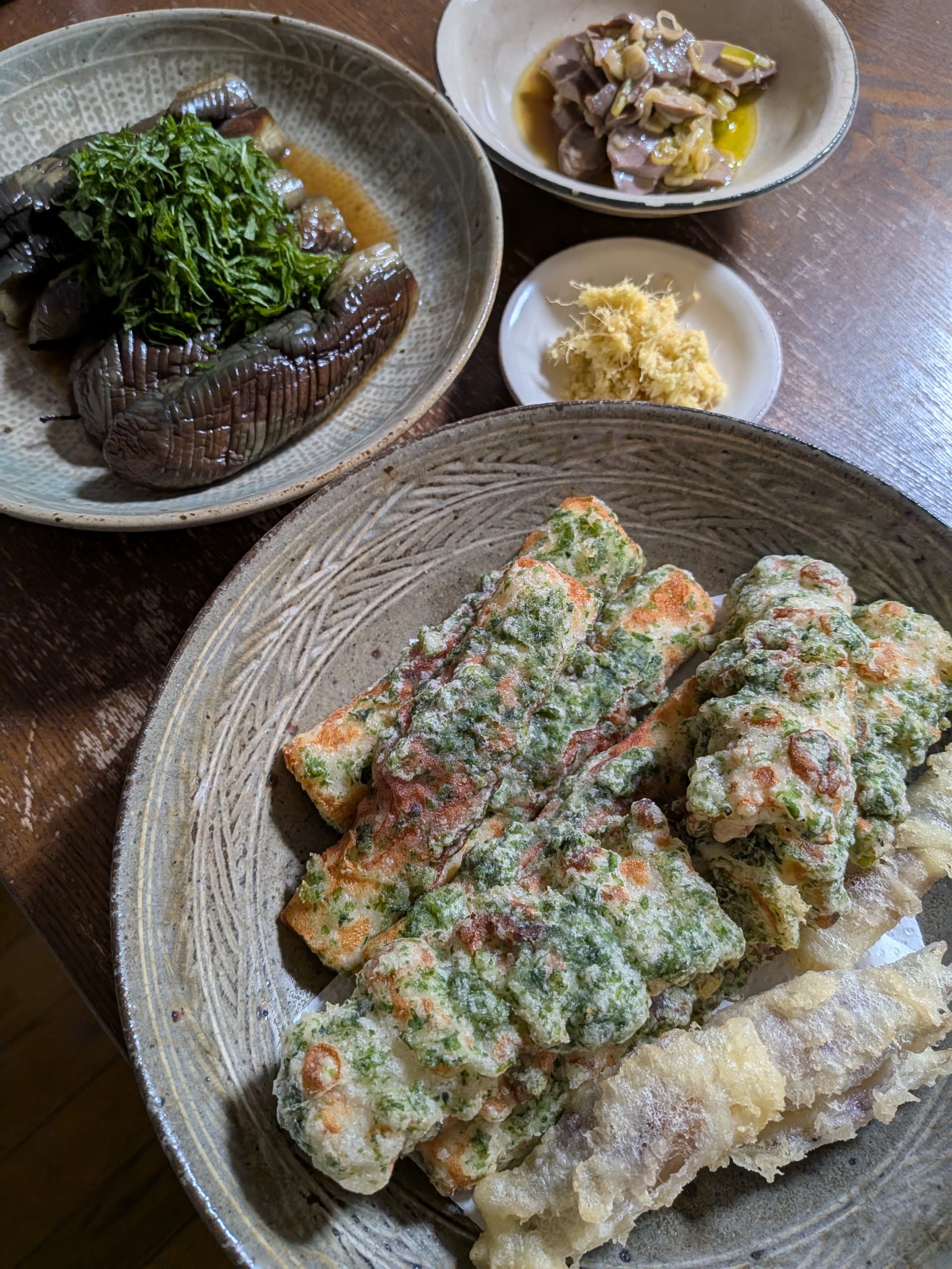 先日調理用のちくわでちくわ天を作ってみたらいつもと違う味わいだったので、今日はいつもちく天で使っている紀文の竹笛でも作って食べ比べしてみた。結果は調理用ちくわのほうが圧倒的に好みだった。竹笛もおいしいのだが、味が濃すぎる。以前から、もう少し味が穏やかだったらいいなとは思っていたので、よくぞ調理用ちくわの存在に気づいた、自分。と褒めておこうと思う。あと、2個残っていたみょうがも一緒に天ぷらに。もうちょっと早く引き揚げてもよかったかも。野菜天の揚げカンはまだまだだなと感じる。夫には砂肝のオイポンドレ和えを出し、私は冷奴。作り置きのなすの焼きびたし。大葉の千切りとおろし生姜を添える。親が送ってくれた豊盃の特別純米酒旨辛口を飲み終わった。ここ数年豊盃って少し甘いなという印象があったがこれはかなり辛口だった。夫はこのあと夕方作った蒸しパンを2個食べてお腹を壊した。相撲が終わったので刑事フォイルの放送も再開となって、ようやく2週間お預けだった「軍事演習」の後半を観られた。いつもながら重厚な人間ドラマで圧倒される。