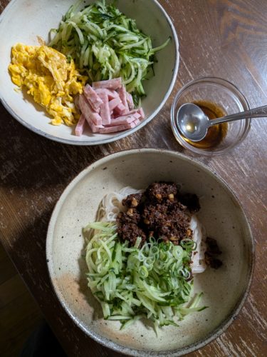 昨日の肉味噌が1人前残っていたので夫には昨日と同じジャージャー麺モドキを出し、私は簡単冷やし中華にする。酸っぱい食べ物は好きじゃないくせに、子供の頃から不思議と冷やし中華はなんとなく好きで、今も暑くなると冷やし中華っぽいものが時々食べたくなる。冷やし中華の具はハム、きゅうり、玉子は絶対で、ほかだとカニカマ、もやしの茹でたの、白ごまあたりかな。しいたけの甘煮とかくらげの戻したのまであったらすごく嬉しいけど、家での食べ物にそこまでは求めない。玉子も錦糸玉子じゃなくて炒り玉子でいい。ゆで玉子でもまあいいか..と思いつつ、汁を吸った焼き玉子ってのが大事な要素なのでできれば玉子は油とともに加熱したものにしたい。そういう意味では、今日には完璧。キュウリ多め、炒り玉子、雲仙ハムの刻んだの。麺と具の割合は1対1か、具が多いくらいでいい。今日のタレは、作り置きの三杯酢に味どうらくの里を混ぜて水でのばしたの。この三杯酢、結構いい味なんだけど何のレシピで作ったのか忘れたのがちょっと残念。麺は親が送ってきた卯月製麺の全粒粉入りそうめん。パッケージに2人前200グラムってあってビビったが、いつも通り100グラム取り出して茹でた。うちはそうめんは1人前50グラムなので乾麺を貰うと長持ちしてまあいいなとは思う。その分、具はたくさん用意するんだけど。食後は長崎次郎書店で買ってきたドリップバッグを開けてコーヒーを入れた。岩下珈琲という阿蘇では知られた焙煎やの豆を使っているそうで、お店で飲んだときも思ったけど、適当にいれたこれもおいしいなと思う。今度通販で買ってみようかな。