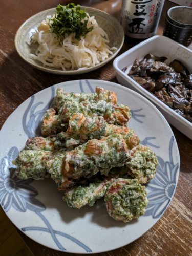 あおさ粉を買ったときからやろうと思っていたちく天を作る。なんかのはずみで天ぷら粉を使ってその便利さの軍門に降って以来、天ぷらに関しては素直に天ぷら粉を使うようになった。絶対確実にカラッと揚がる手堅さは本当にありがたい。何でもいいんだけどいつもニップンの華さくりを買ってしまう。多分小袋サイズで売っていて、お安いからだと思う。ちく天は夫の好物なのでよく作っているが、いつも紀文の竹笛、もしくはそれと同様のちくわを使っていたのだけど、夫がいつものプリプリしたのじゃなくて焼きちくわやってみてというので、今回はコープの調理用焼きちくわを使ってみた。いつもと全然食感も塩気も違っていて、マイルドで食べやすい。大根を買っていたので、割りホタテの水煮缶を開けてホタテマヨネーズサラダ。今日のはとびきりおいしかったと夫が言うので分量目安を書いておこう。大根は分厚く皮を剥いた状態のものを300グラム、気持ち太めの千切りにして1%の塩(3グラム)をまぶしてしばらく置く。しっかり水気を絞ってから新しいボウル入れ、汁気を切ったホタテ水煮をほぐしながら入れて和える。マヨネーズ大さじ1ずつ入れて和え、最終的に大さじ3入れる。その時に隠し味にきび砂糖2つまみ。皿に盛って、刻んだ青じそをのせる。青じそ以外の薬味は合わないのでなければ何も添えない。コツは、大根に塩をしたら長く置きすぎないこと、力のかぎりしっかり絞ること、食べる直前に作ること(つくおきはしない)。今日は相撲はオンタイムで見てしまったが、あれだけいた2敗3敗力士がポロポロ脱落していって、結局平幕の3人に優勝可能性が絞られてしまった。明日の千穐楽は下手すると三役前に優勝が決まってしまうかも。巴戦なったら面白いけどどうなんだろうなあ。