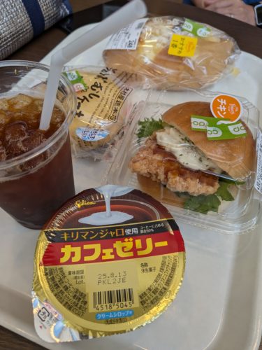 朝は一昨日封を開けたブラウン食パンの最後の1枚で簡単玉子サンドとアイスミルクコーヒー。玉子サンドはゆで玉子を半分に割ったのと小さくちぎって散らしたキリ、マヨネーズ。しみじみおいしい。パンはもともとカサっとしたパンだったのもあって、特に問題なかった。もともとあんまり焼き立てにこだわりないし、いい塩梅に具挟めればいいやというところがあるので、実はそんなにパンが好きってわけじゃないのかもしれない。昼は夫の希望でコープのイートイン。3種のチーズパンが最近お気に入りなので隙あらば食べたいようなのだった。私は唐揚げを挟んだバーガー。デザートにグリコカフェゼリーとチーズ蒸しパン。お昼の前に久々に駅前に買い物に出たが、夏休みの割に若いのがあんまりいなくて年寄りばっかりな印象があった。午前中だったからだろうか。神社にカラフルなのぼりがたくさん立っていて、明日は八朔相撲かと気づく。