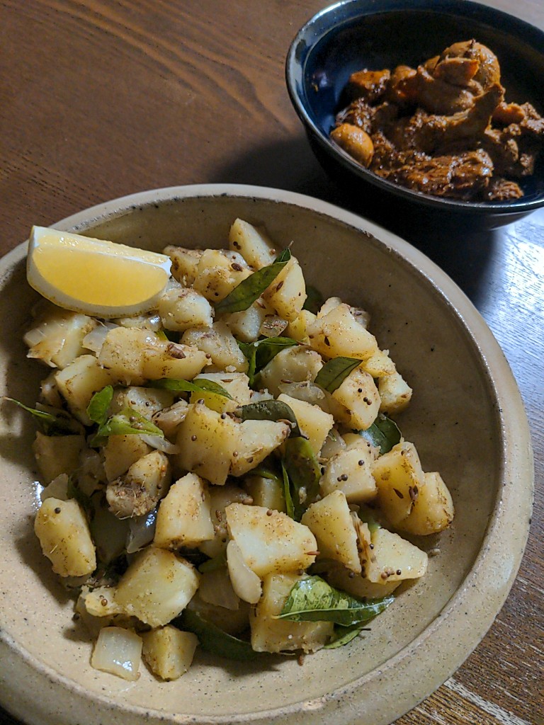 - じゃがいもは皮ごと丸のまま茹でておく。串が通るまで軟らかく煮たら皮をむいて、大きめの乱切りにしておく
