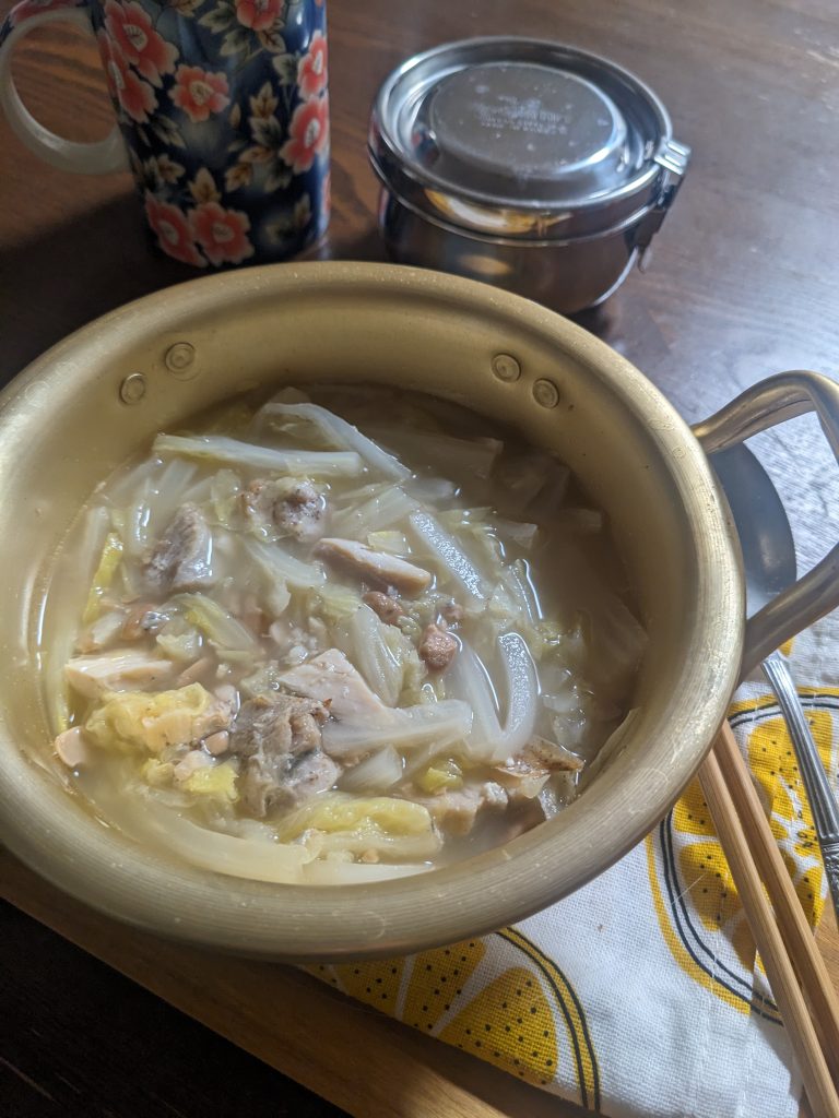 サラダは、白菜とリンゴのサラダ。リンゴがグラニースミスなので甘さがなく、ちょっと味にお愛想がないかなと、薄く切って焼いたシャウエッセンを乗せてみたけど、あんまり合っていなかったかも。やっぱり、カリカリベーコンの方が良かったかなぁ。パンは、タカキベーカリーのモーニングフランス(全粒粉)。夫が小倉に行く前に作ったミルクフランスのクリームが少し残っていたので、それを出したが、特に問題なかった様子。このクリーム、時々食べたくなるから、1回で使い切れる量を少し探っていかねば。